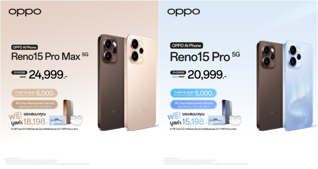 ลูกค้าที่จอง OPPO Reno15 Pro Max 5G จะได้รับสิทธิพิเศษมูลค่ารวม 18,198 บาท ประกอบด้วย E-VIP Card ประกันจอแตก 1 ครั้งภายใน 2 ปี มูลค่า 15,000 บาท Refresh Service บริการติดฟิล์มกันรอยฟรีภายใน 2 ปี มูลค่า 1,199 บาท และหูฟัง OPPO Enco Air4 มูลค่า 1,999 บาท