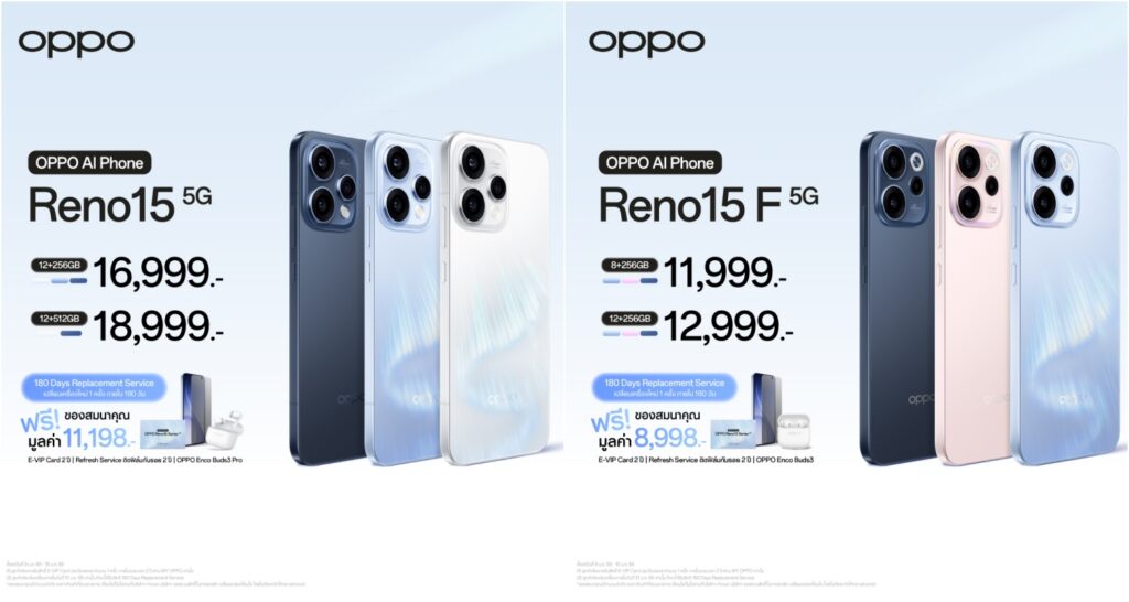 ลูกค้าที่จอง OPPO Reno15 Pro 5G จะได้รับสิทธิพิเศษมูลค่า 15,198 บาท ลูกค้าที่จอง OPPO Reno15 5G จะได้รับสิทธิพิเศษมูลค่า 11,198 บาท และลูกค้าที่จอง OPPO Reno15 F 5G จะได้รับสิทธิพิเศษมูลค่า 8,998 บาท โดยแต่ละแพ็กเกจจะมีของสมนาคุณและบริการที่แตกต่างกันไปตามรุ่น