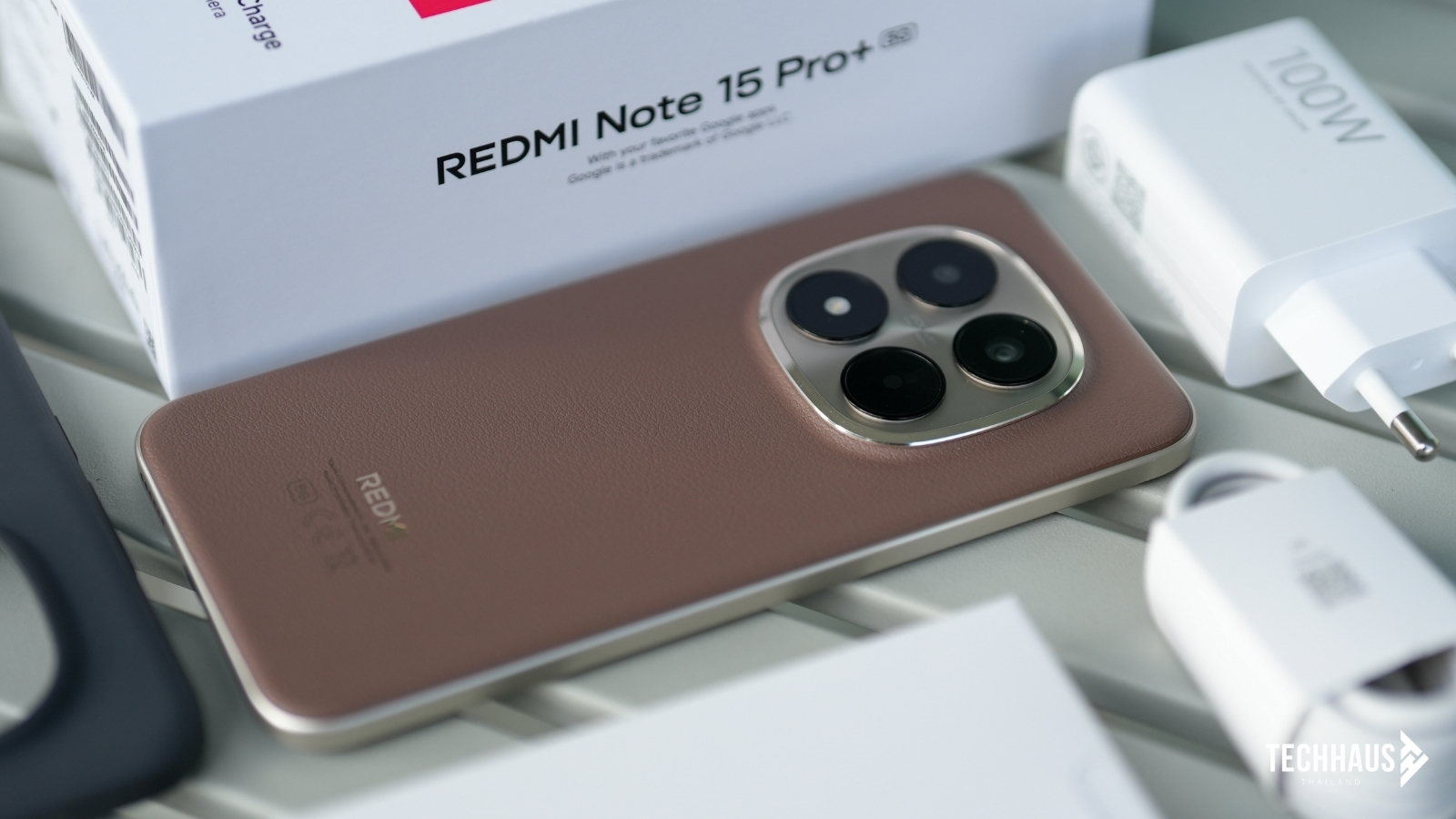 มาเริ่มต้นกันที่การแกะกล่องครั้งแรก เปิดกล่องมาก็พบกับตัวเครื่องสมาร์ตโฟน REDMI Note 15 Pro+ 5G ที่โดดเด่นด้วยดีไซน์ลาย Volcanic Deco แบบลอยตัว สายชาร์จ และหัวชาร์จเร็ว 100W HyperCharge ที่มาพร้อมกล่อง พร้อมคู่มือการใช้งาน