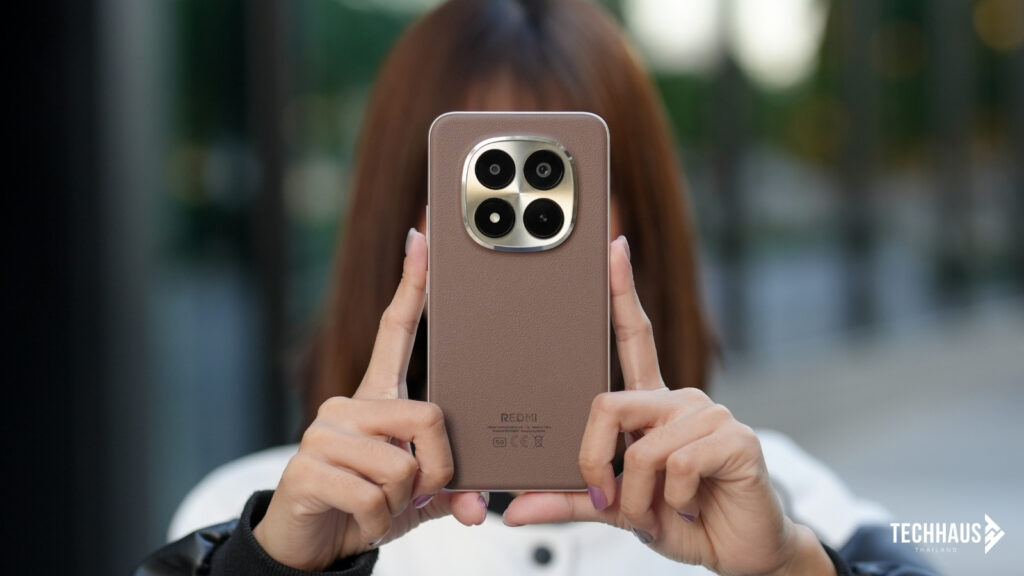 โมดูลกล้องหลังออกแบบเป็นสี่เหลี่ยมขอบมนที่ดูสมดุลกับตัวเครื่อง ขอบเลนส์ทำสีกลมกลืนกับตัวเครื่อง ภายในจัดเรียงกล้องหลัก 200MP, กล้อง Ultra-Wide 8MP และไฟ LED flash อย่างเป็นระเบียบ ด้านล่างมีตัวอักษร REDMI พร้อมโลโก้ Android 15 และ HyperOS 2 ที่บ่งบอกถึงระบบปฏิบัติการล่าสุด