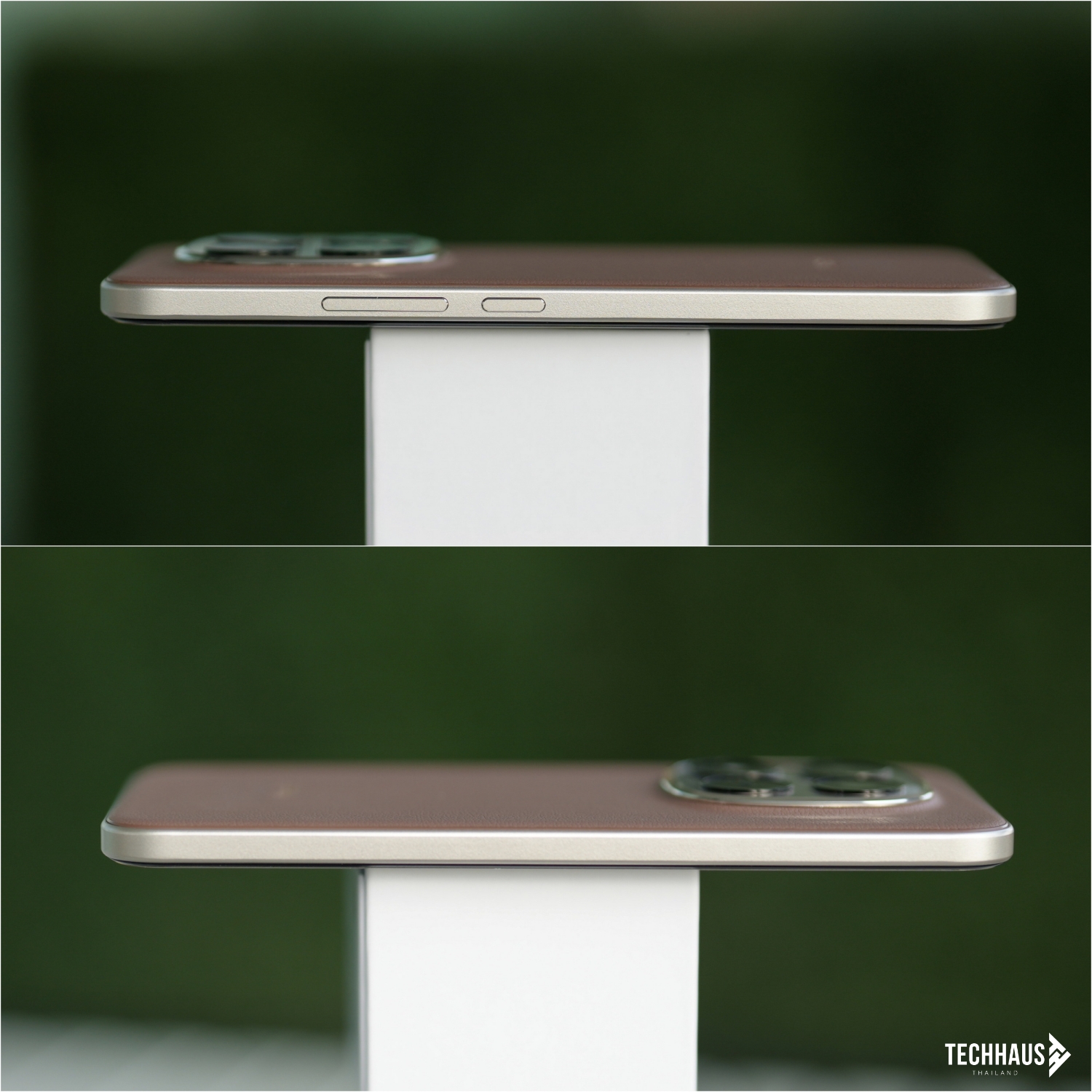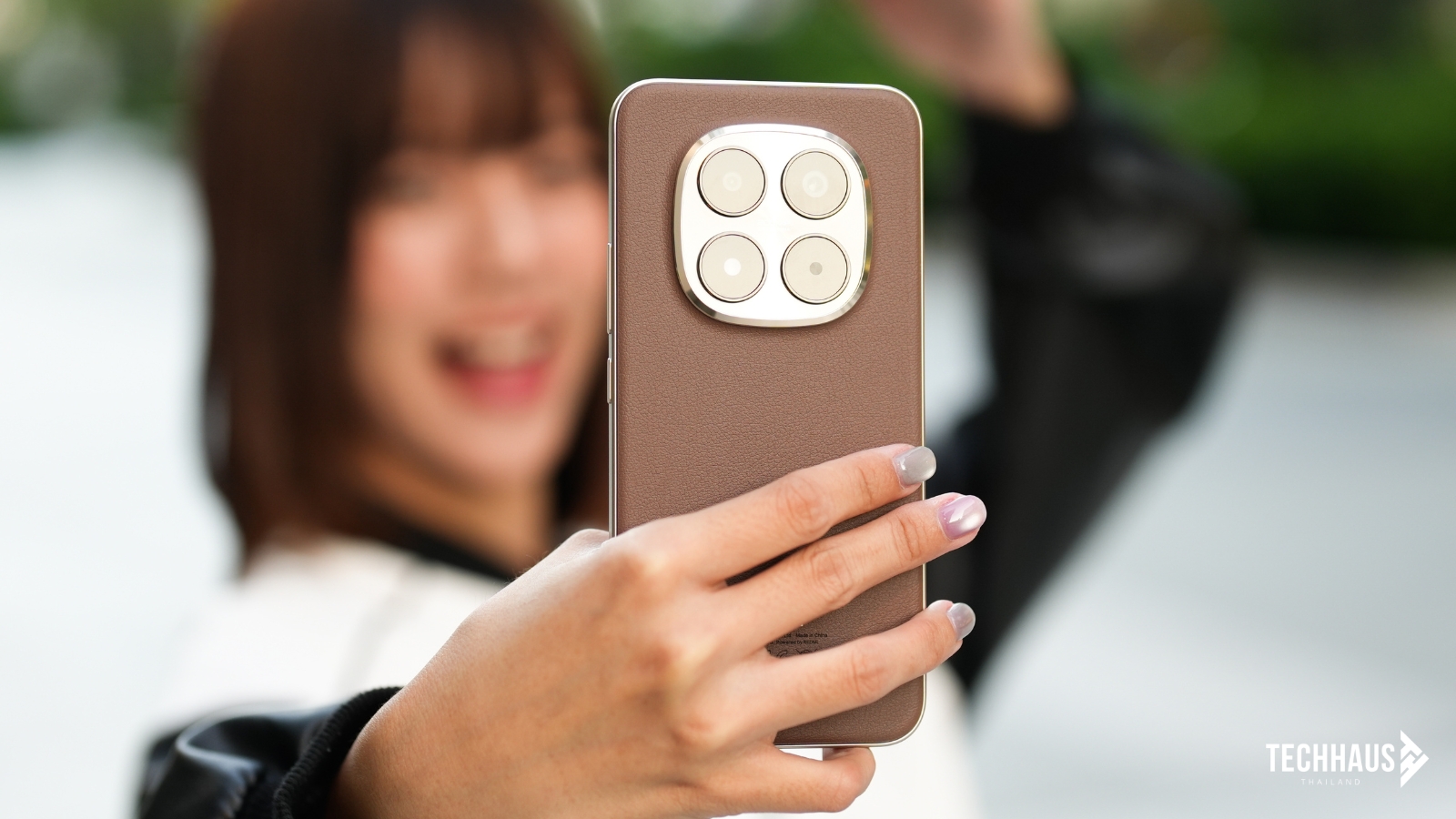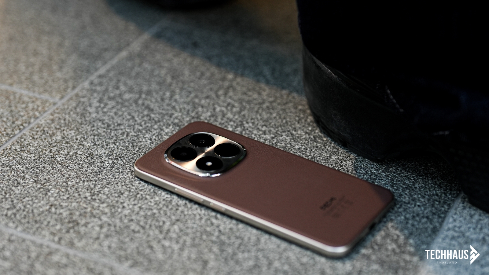 พลิกดูด้านหลัง คุณจะได้พบกับฝาหลังที่โดดเด่นด้วยลาย Volcanic Deco แบบลอยตัว โดยเฉพาะสี Mocha Brown ที่ใช้วัสดุแบบหนังเทียมให้สัมผัสนุ่มนวลพรีเมียม จับแล้วอุ่นมือและมีกริปที่ดี ในขณะที่สี Black และ Glacier Blue เลือกใช้ฝาหลังไฟเบอร์กลาสความแข็งแกร่งสูง ซึ่งช่วยดูดซับแรงกระแทกได้ดีโดยไม่เพิ่มน้ำหนัก แต่ละสีจึงมอบความรู้สึกหรูหราและทนทานในแบบของตัวเอง