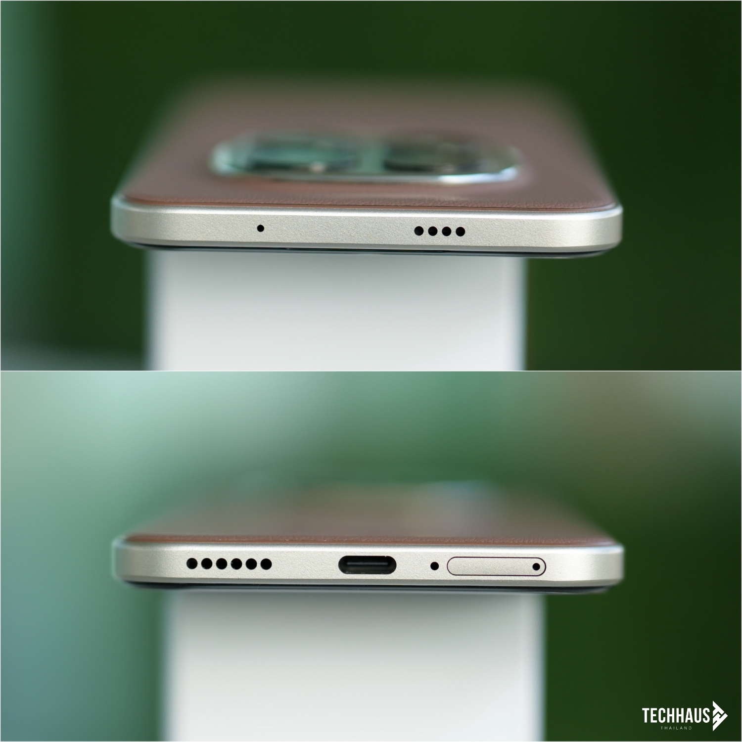 ด้านบนมีไมโครโฟนตัดเสียงรบกวน ด้านล่างครบครันที่สุด มีช่องใส่ซิมการ์ด Dual SIM (Nano SIM 2 ช่อง หรือ Nano SIM + eSIM), ไมโครโฟนตัดเสียงรบกวน, พอร์ต USB Type-C ตรงกลาง และลำโพงที่ทำงานร่วมกับลำโพงด้านบนเป็นระบบสเตอริโอ