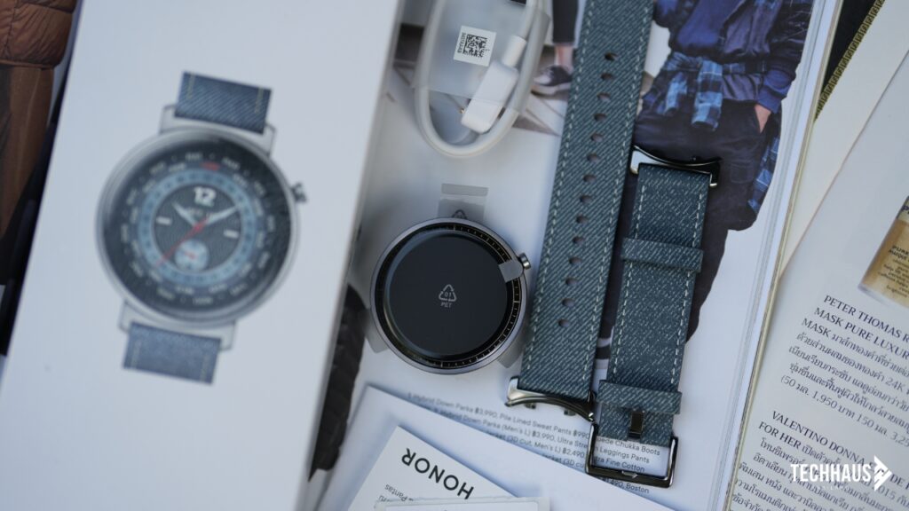 สมาร์ตวอชท์มีให้เลือกสองสไตล์ รุ่น Phantom Black สีดำพร้อมสายซิลิโคน เหมาะกับคนชอบออกกำลังกายหนักๆ ส่วนรุ่น Denim Blue สีน้ำเงินเดนิมมาพร้อมสายหนังผสมผ้ายีนส์ ซึ่งเป็นนวัตกรรมแรกในวงการสมาร์ตวอชท์ สายนาฬิกาขนาด 20 มิลลิเมตรถอดเปลี่ยนได้ง่าย เปลี่ยนสไตล์ได้ตามอารมณ์