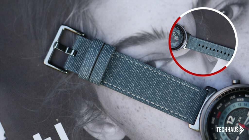 ตัวเรือนทำจากอะลูมิเนียมอัลลอยด์แข็งแรง หน้าปัดลายคล้ายเคฟลาร์ดูทันสมัย สายนาฬิกา 20 มิลลิเมตรมีสองแบบคือสายซิลิโคนและสายหนังผสมยีนส์ ถอดเปลี่ยนได้ง่าย