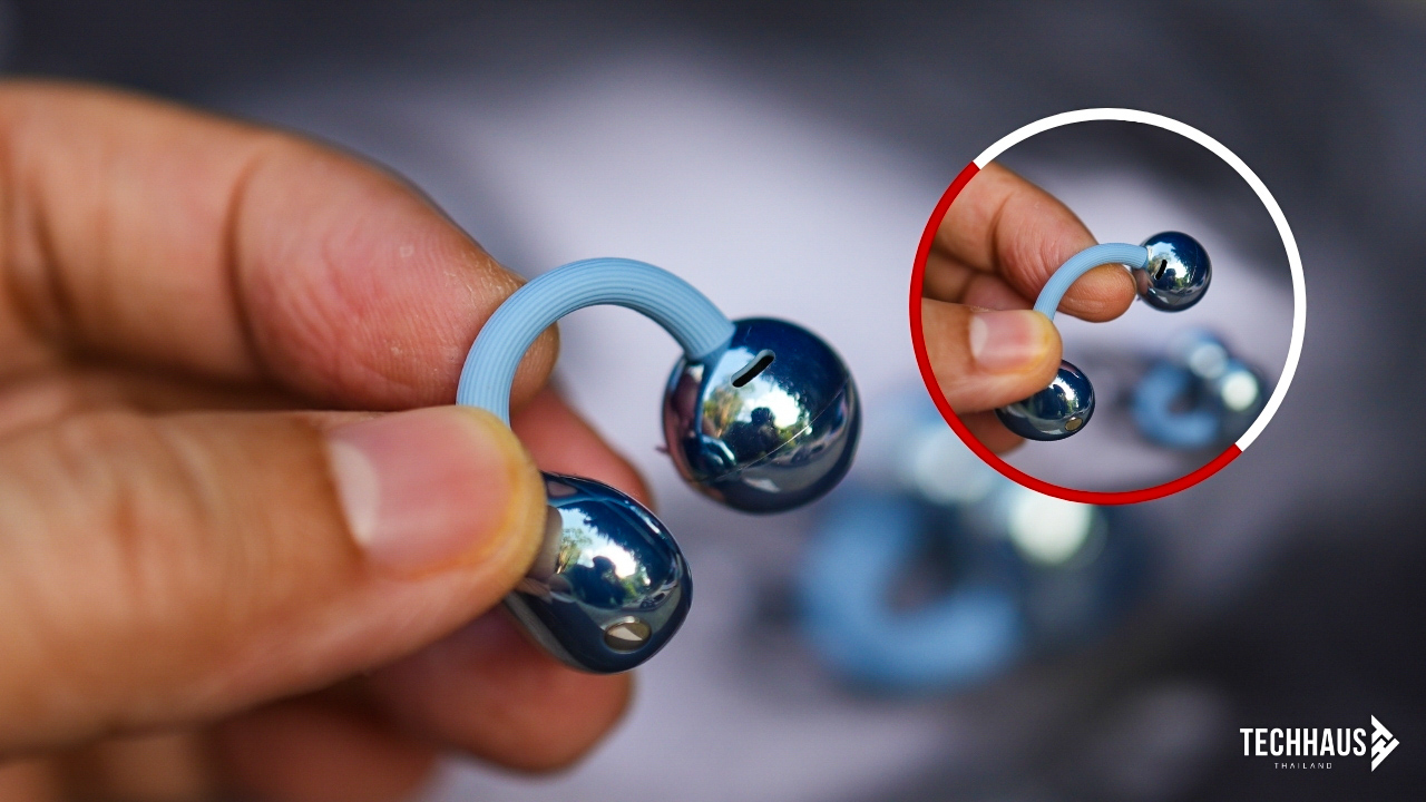 C-Bridge ไม่ใช่แค่สายเชื่อมธรรมดา แต่ออกแบบมาอย่างพิถีพิถันจากข้อมูลโครงสร้างหูของคนมากกว่า 10,000 ตัวอย่าง ผ่านการทดสอบกับรูปร่างใบหูที่หลากหลายถึง 10,000 แบบ ทำจากโลหะผสมแบบ Shape-memory ที่หุ้มด้วยซิลิโคนเนื้อนุ่ม ให้ความยืดหยุ่นและนุ่มนวลมากขึ้นถึง 25% เมื่อเทียบกับรุ่นแรก ทำให้ยึดติดกับหูอย่างมั่นคงแต่ไม่กดทับจนเกินไป เบาสบายเหมือนปุยนุ่น แต่หนีบใบหูได้แน่นกระชับ ไม่ต้องกลัวหลุดแม้จะใส่ไปออกกำลังกาย