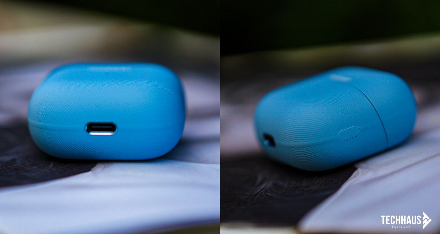 เคสชาร์จได้รับการออกแบบใหม่เป็นทรงสี่เหลี่ยมที่ดูทันสมัยและกะทัดรัด น้ำหนักเบาลงถึง 14% และขนาดเล็กลง พกพาสะดวก เข้ากระเป๋าเสื้อหรือกระเป๋ากางเกงได้ง่าย ที่น่าประทับใจคือช่องเก็บหูฟังที่ออกแบบให้ C-Bridge และ Acoustic Ball ของหูทั้งสองข้างอยู่ในตำแหน่งไขว้กันอย่างเป็นเอกลักษณ์ ดูเก๋และแปลกตา วัสดุที่ใช้ทำเคสมีพื้นผิวคล้ายผ้า ให้สัมผัสนุ่มนวลและทนทานต่อรอยขีดข่วน ใช้นานเท่าไหร่ก็ยังดูใหม่และสวยงาม