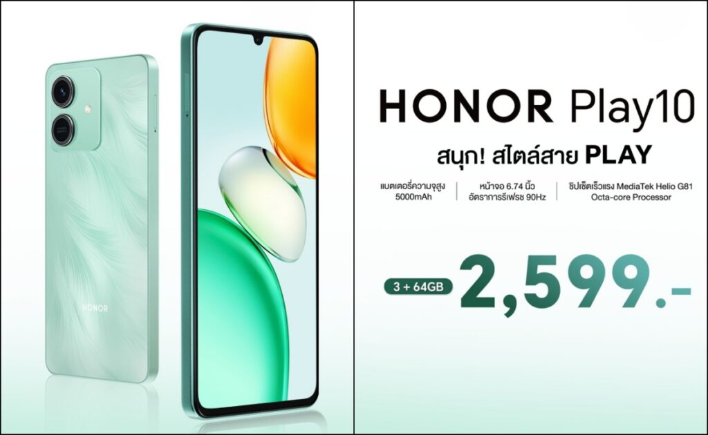 นอกจากการเปิดตัว HONOR X5c Plus แล้ว HONOR ยังเสริมทัพสมาร์ตโฟนรุ่นคุ้มค่าอีกหนึ่งรุ่นที่น่าจับตามองอย่าง HONOR Play 10 ภายใต้คอนเซ็ปต์ “สนุก สไตล์สายเพลย์” ที่ออกแบบมาเพื่อตอบโจทย์ผู้ใช้งานที่มองหาความคุ้มค่าควบคู่กับประสิทธิภาพที่เพียงพอต่อการใช้งานในชีวิตประจำวัน