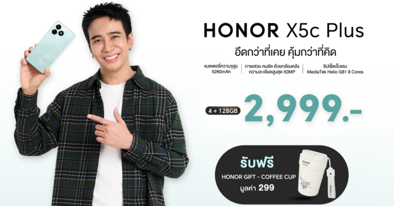 HONOR X5c Plus วางจำหน่ายในราคา 2,999 บาท มี 2 สีให้เลือก ได้แก่ สี Meteor Silver และสี Ocean Cyan พร้อมรับโปรโมชั่นพิเศษเมื่อซื้อรับฟรี HONOR Gift – Coffee Cup มูลค่า 299 บาท ตั้งแต่วันที่ 23 มกราคม 2569 ถึงวันที่ 28 กุมภาพันธ์ 2569 หรือจนกว่าของแถมจะหมด จำหน่ายที่ HONOR Experience Store ทุกสาขา และร้านค้าตัวแทนจำหน่ายทั่วประเทศ