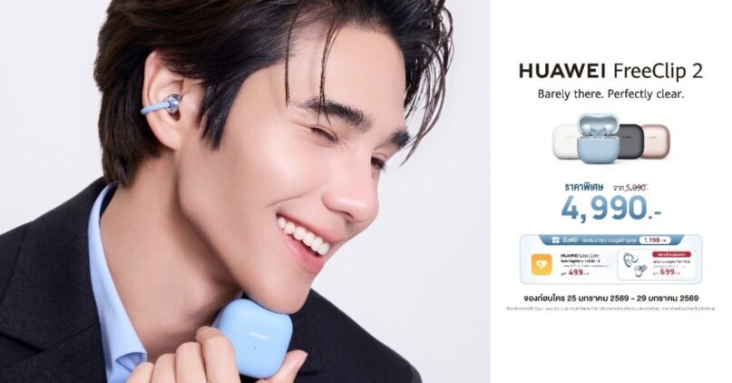 หัวเว่ย คอนซูมเมอร์ บิสสิเนส กรุ๊ป (ประเทศไทย) ประกาศเปิดตัว HUAWEI FreeClip 2 อย่างเป็นทางการ โดยเปิดให้สั่งจองล่วงหน้าตั้งแต่วันที่ 25-29 มกราคม 2569 ในราคาพิเศษ 4,990 บาท จากราคาปกติ 5,990 บาท ซึ่งถือเป็นการตอกย้ำความมุ่งมั่นของแบรนด์ในการนำเสนอนวัตกรรมเสียงอัจฉริยะและดีไซน์ทันสมัยให้เข้าถึงได้ง่ายในราคาที่คุ้มค่า
