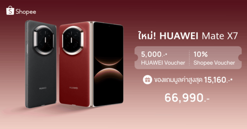 ผู้สนใจสามารถเปิดพรีออเดอร์ HUAWEI Mate X7 ผ่าน Shopee ตั้งแต่วันที่ 6-13 กุมภาพันธ์ 2569 โดยสามารถผ่อนชำระ 0% นานสูงสุด 5 เดือน พร้อมรับโค้ดส่วนลดจากหัวเว่ย 5,000 บาท และของสมนาคุณมากมาย ได้แก่ HUAWEI WATCH GT5 สุ่มแบบ มูลค่า 6,990 บาท, HUAWEI SuperCharge 66W Adapter มูลค่า 1,690 บาท, HUAWEI Rotating Stand Aramid Fiber Case มูลค่า 1,490 บาท และการรับประกันซ่อมหน้าจอ 1 ครั้งต่อปีมูลค่า 4,990 บาท