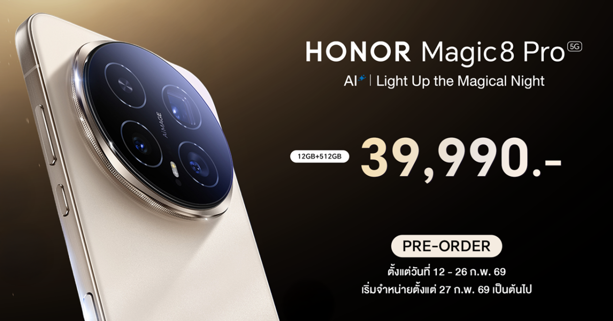 HONOR เปิดตัว HONOR Magic8 Pro อย่างเป็นทางการในประเทศไทย สมาร์ตโฟนเรือธงรุ่นล่าสุดภายใต้คอนเซปต์ “AI Light Up the Magical Night” ชูจุดเด่นกล้องเทเลโฟโต้ 200MP ชิป Snapdragon 8 Elite Gen 5 แบตเตอรี่ 7,100mAh พร้อม AI จัดเต็ม ในราคา 39,990 บาท