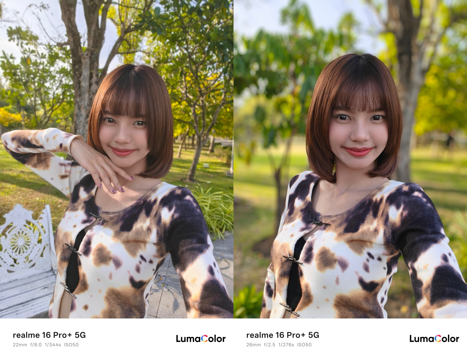 สิ่งที่ทำให้ realme 16 Pro 5G น่าสนใจมากกว่าคู่แข่งในระดับเดียวกันคือ Golden Focal Portrait Camera ที่ให้เลนส์พอร์ตเทรตให้เลือกถึง 5 ระยะ ได้แก่ 1x, 1.5x, 2x, 3.5x และ 4x ครอบคลุมทุกระยะที่ต้องการ ตั้งแต่ถ่ายเต็มตัวจนถึงถ่ายใกล้แค่ใบหน้า โบเก้เนียนระดับเส้นผม มิติความลึกแบบ 3D สมจริง