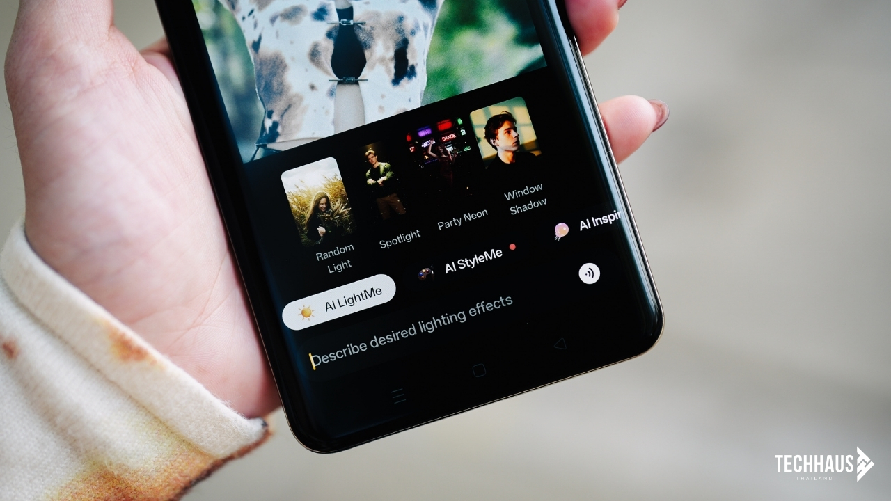 ส่วน AI LightMe ช่วยเพิ่มแสงให้รูปพอร์ตเทรตหลังถ่ายเสร็จแล้ว มีให้เลือกถึง 4 สไตล์ ทั้ง Window Shadow, Party Neon, Spotlight และ Random Light เพิ่มมิติให้รูปได้โดยไม่ต้องแต่งเอง