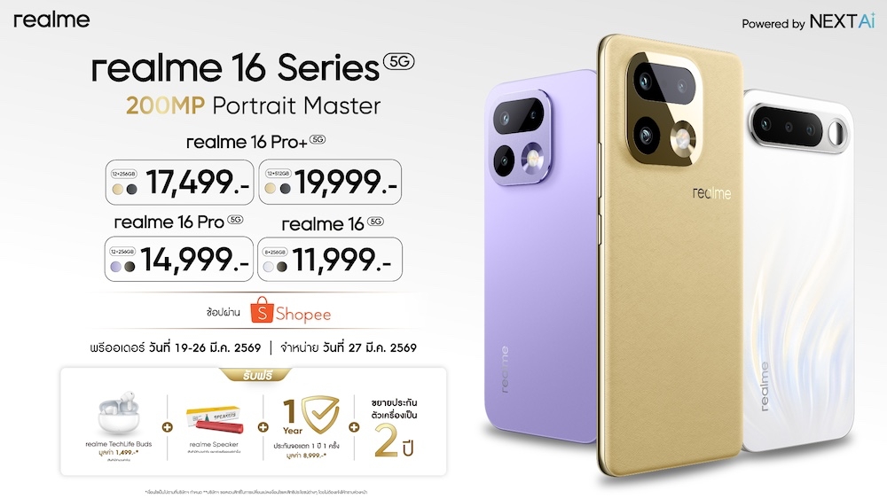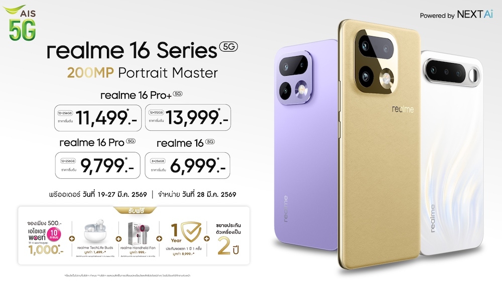 ถ่ายพอร์ตเทรตสวยระดับสตูดิโอ! realme 16 Series 5G เปิดตัว 3 รุ่นพร้อมกัน ชู 200MP LumaColor ราคาเริ่ม 11,999 บาท
