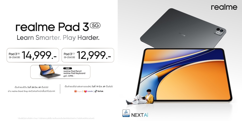 realme Buds T500 Pro ราคา 1,499 บาท พิเศษ! เมื่อซื้อคู่กับ realme 16 Series 5G ตั้งแต่วันที่ 19 มีนาคม–15 เมษายน รับสิทธิ์ซื้อในราคาเพียง 1,299 บาท จำหน่ายผ่าน realme Brand Shop ตัวแทนจำหน่ายชั้นนำ และช่องทางออนไลน์ Shopee, Lazada และ TikTok Shop สำหรับ realme Pad 3 ราคาเริ่มต้น 12,999 บาท (รุ่น Wi-Fi) และ 14,999 บาท (รุ่นใส่ซิมการ์ด) รับฟรี realme Pad Pencil และ realme Pad Keyboard วางจำหน่ายตั้งแต่ 28 มีนาคมเป็นต้นไป