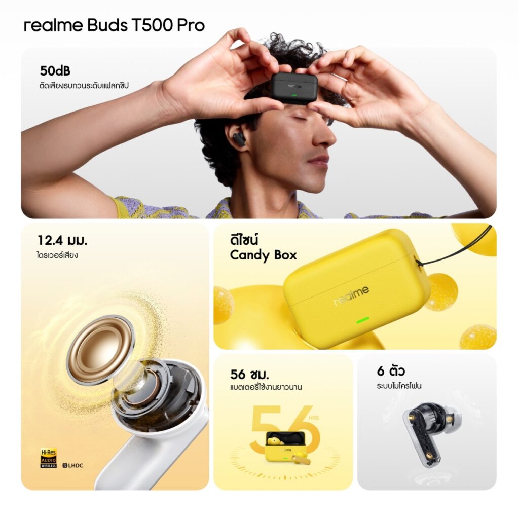 นอกจากสมาร์ตโฟนทั้ง 3 รุ่น realme ยังเปิดตัวแก็ดเจ็ตเสริมอีก 2 ชิ้น ได้แก่ realme Buds T500 Pro หูฟังไร้สายมาพร้อมไดรเวอร์ขนาด 12.4 มม. รองรับ 3D Spatial Audio (เสียงเสมือนรอบทิศทาง) ระบบตัดเสียงรบกวน ANC ระดับ 50dB ร่วมกับ AI Deep Noise Cancellation ผ่านไมค์ 6 ตัว เชื่อมต่อ Bluetooth 6.1 แบตใช้งานได้สูงสุด 56 ชั่วโมง กันน้ำกันฝุ่น IP55 และมีฟีเจอร์ AI Live Translation แปลภาษาแบบเรียลไทม์