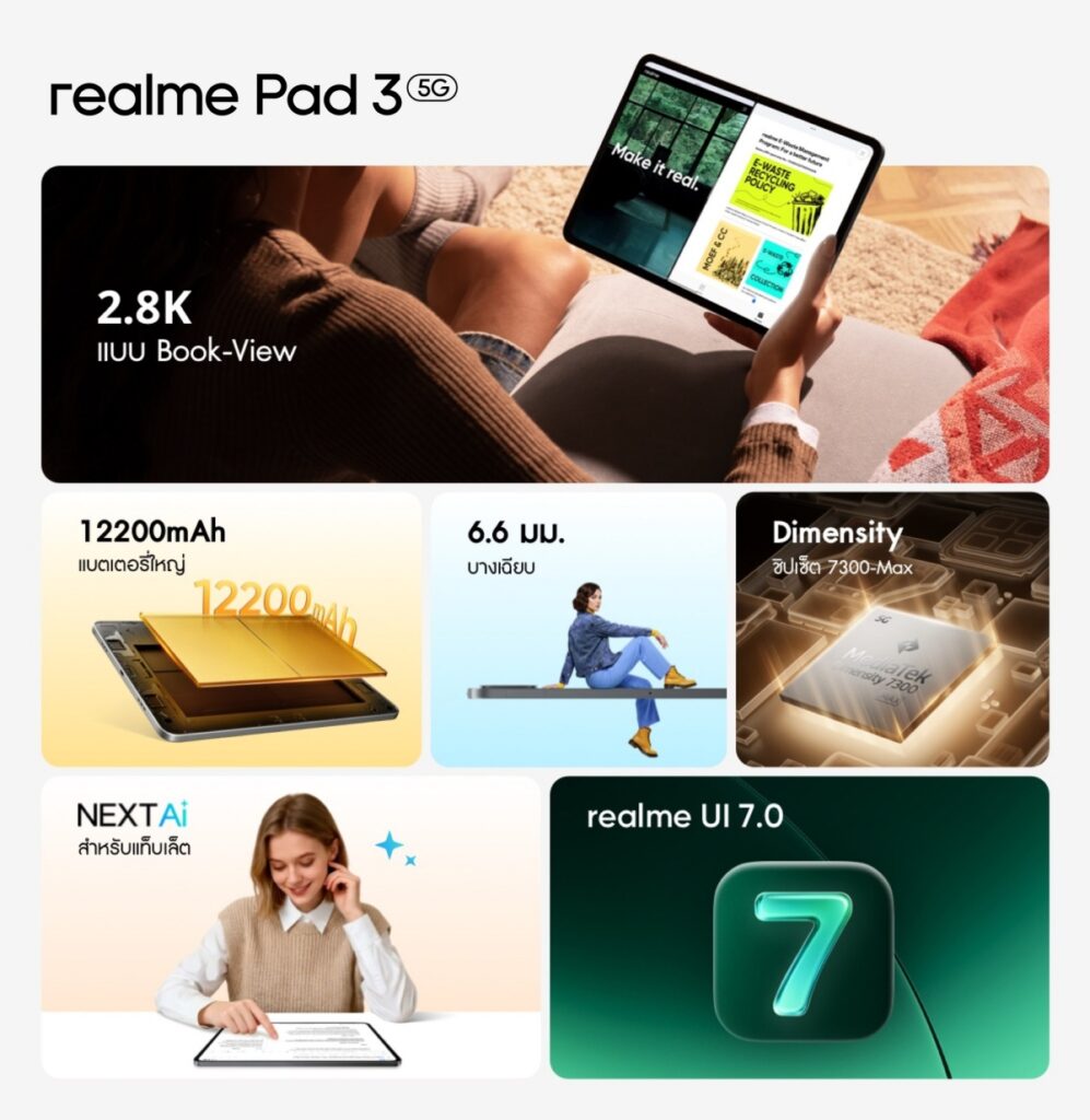 และ realme Pad 3 แท็บเล็ตดีไซน์ Book-View ตัวเครื่องบางเพียง 6.6 มม. น้ำหนัก 578 กรัม จอขนาด 11.61 นิ้ว ความละเอียด 2.8K รีเฟรชเรต 120Hz ขับเคลื่อนด้วยชิป Dimensity 7300-Max ลำโพง Quad Speakers 4 ตัว แบตเตอรี่ 12,200mAh ชาร์จเร็ว 45W พร้อมฟีเจอร์ Next AI ช่วยจดโน้ตและส่งเสริมการเรียนรู้