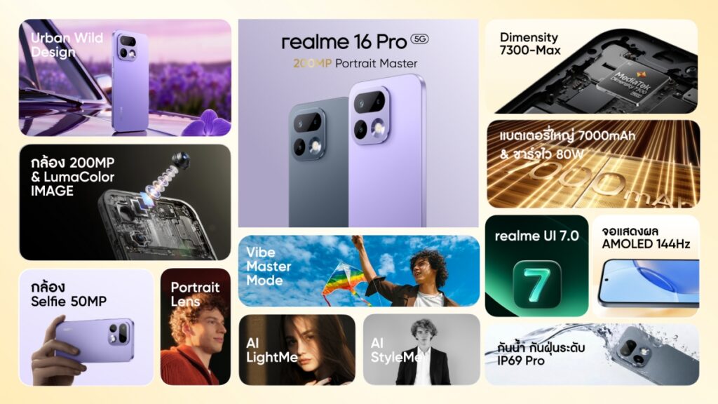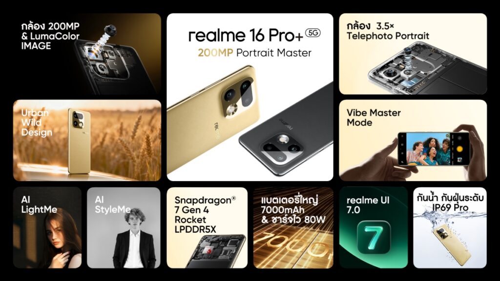 สำหรับ realme 16 Pro 5G รุ่นกลางของซีรีส์ มาพร้อมกล้อง 200MP LumaColor ชุดเดียวกับรุ่นพี่ ใช้เซ็นเซอร์ Samsung HP5 ระบบกันสั่น Super OIS และ Golden Portrait Lens Kit ครบ 5 ระยะ พร้อมเทคโนโลยีเบลอฉากหลังระดับเส้นผมและมิติภาพแบบ 3D รองรับการบันทึกวิดีโอ 4K HDR ทั้งเลนส์ 1x และ 2× มี AI Instant Clip สร้างไฮไลต์คลิปอัตโนมัติ ขับเคลื่อนด้วยชิปเซ็ต Dimensity 7300-Max 5G ที่ทำคะแนน AnTuTu ทะลุ 970,000 คะแนน จับคู่แบตเตอรี่ Titan 7000mAh พร้อม AI Long-life Battery และ All-Scenario Bypass Charging ลดความร้อนขณะชาร์จ ผ่านมาตรฐานกันน้ำกันฝุ่น IP69 หน้าจอ AMOLED ขนาด 6.78 นิ้ว ความละเอียด 1.5K รีเฟรชเรต 144Hz ความสว่าง 6,500nit รองรับสีสูงถึง 1.07 พันล้านสี ดีไซน์ยังคงปรัชญา Urban Wild ของ “นาโอโตะ ฟุคาซาวะ” ผ่านสี Pebble Grey และ Orchid Purple พร้อมผิวสัมผัส Velvet Matte ระดับพรีเมียม
