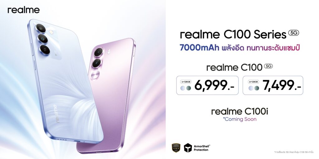 realme เปิดตัว realme C100 5G และ realme C100i สมาร์ตโฟน C100 Series แบตอึด 7,000mAh ทนทานมาตรฐานทหาร พร้อมฟีเจอร์ AI ระดับเรือธง ราคาเริ่มต้นเพียง 6,999 บาท