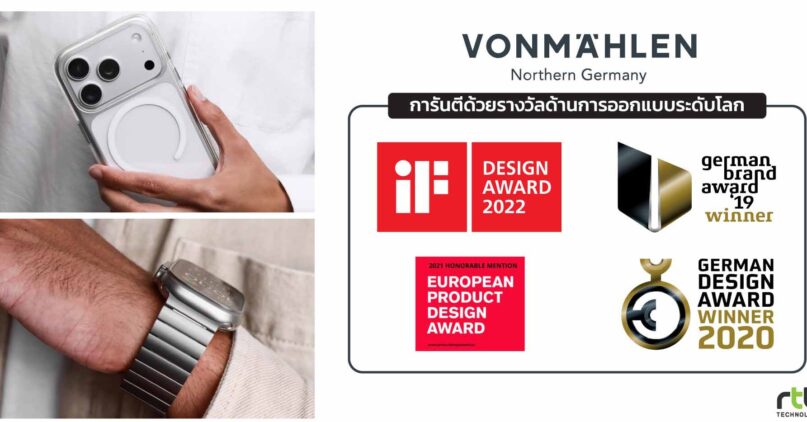 บริษัท อาร์ทีบี เทคโนโลยี จำกัด ผู้นำด้านการจัดจำหน่ายสินค้าไอทีและแกดเจ็ตในประเทศไทย ประกาศเปิดตัวผลิตภัณฑ์ไลน์อัปใหม่จากแบรนด์ VONMÄHLEN (ฟอนแมเล่น) แบรนด์อุปกรณ์เสริมสมาร์ทดีไวซ์ระดับพรีเมียมจากเมืองฮัมบูร์ก ประเทศเยอรมนี ที่การันตีคุณภาพด้วยรางวัลการออกแบบระดับโลก อาทิ iF Design Award 2022, German Brand Award 2019 และ German Design Award 2020 โดยผลิตภัณฑ์ครอบคลุมทั้งกลุ่มเคสและสายสำหรับ Apple Watch และ iPhone 17 Series ภายใต้แนวคิด Seamless Experience หรือประสบการณ์ใช้งานที่ไร้รอยต่อภายใน Apple Ecosystem