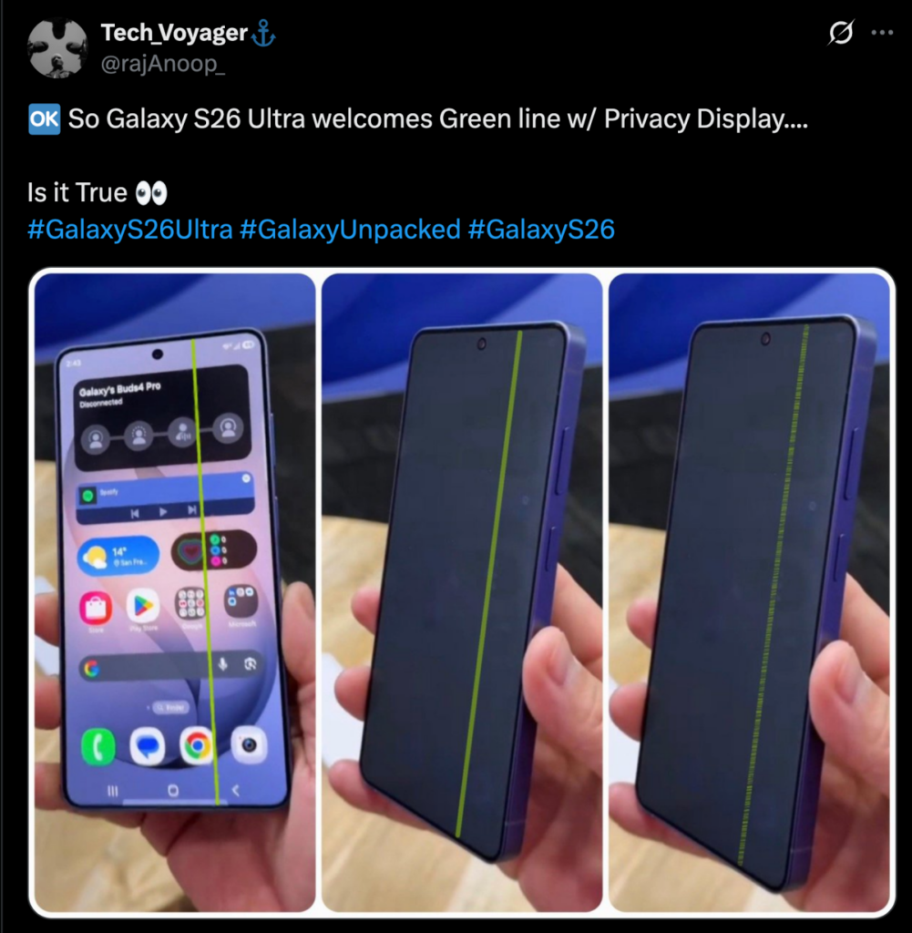 ขณะเดียวกัน ก็มีหลักฐานบางส่วนที่ถูกตั้งข้อสังเกตว่าอาจเป็นของปลอม โดยมีภาพถ่ายที่อ้างว่าเป็น Galaxy S26 Ultra ที่มีเส้นสีเขียวหนาผิดปกติ ซึ่งผู้ใช้ในชุมชนออนไลน์หลายคนระบุว่านี่เป็นของปลอมอย่างชัดเจน